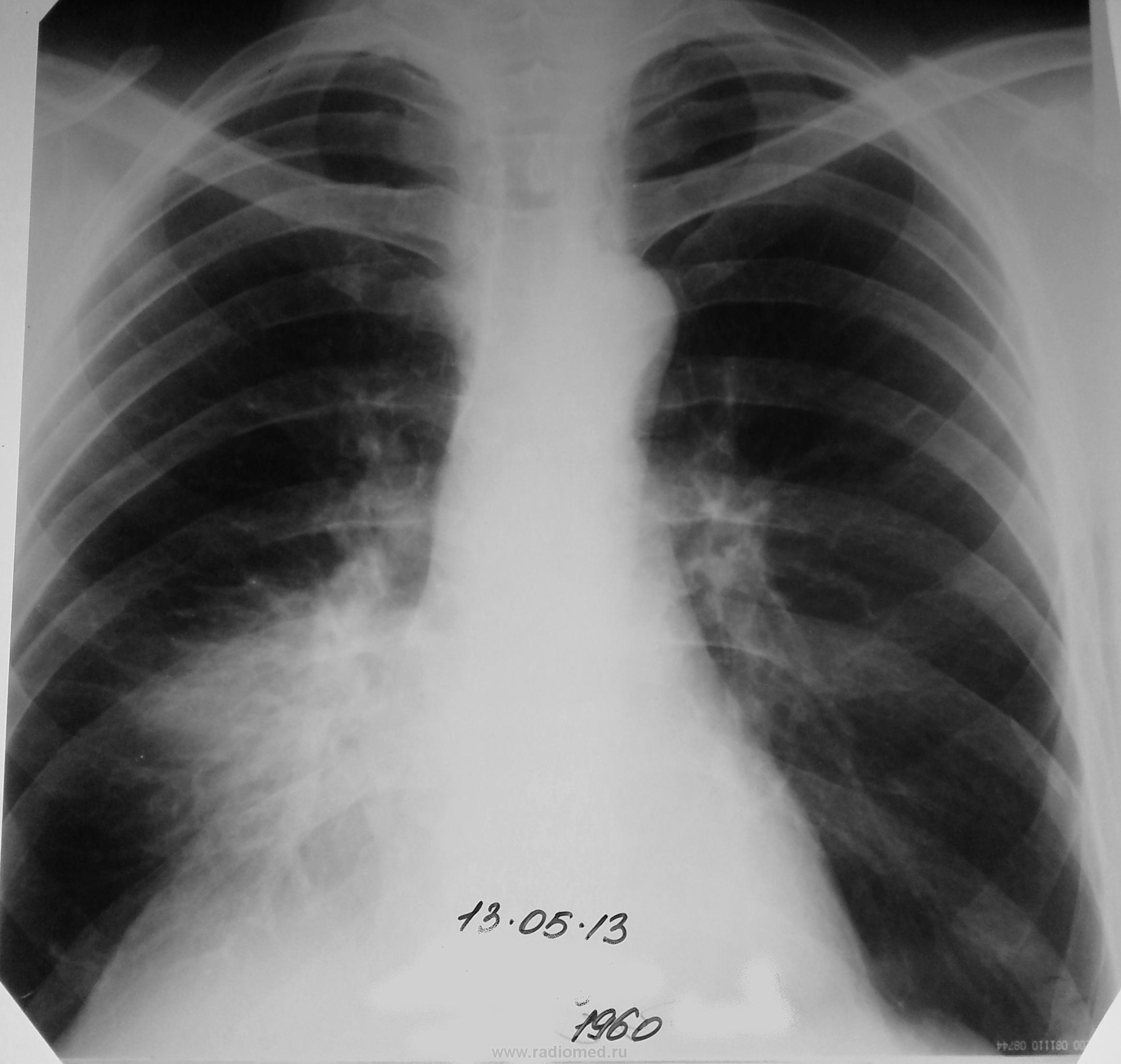 Где узловое образование? Затемнение средней доли есть, уменьшение объема - сомнительно. Смущает немного более высокое стояние диафрагмы в переднем отделе.