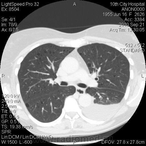 Немного предыстории: женщина поступила в плановое хирургическое отделение, по поводу кистозного образования в проекции головки ПЖ. (месяц назад лечилась по поводу острого панкреатита в другой больнице). В настоящее время на УЗИ - киста в области головки ПЖ. Мы сделали КТ - типичная карина псевдокисты в области головки. Но меня заинтересовали легкие. Из анамнеза узнал, что с 2004 года у пациентки постоянные рецидивирующие хилотораксы (лечилась во множестве больниц, диагноз не установлен). Вообщим сделали вчера КТ ОГК - что и выставляю.