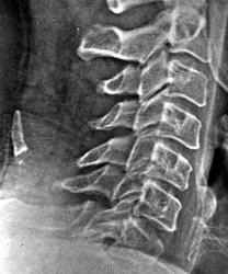 Стандарт исследования при травме предполагает минимум 2 проекции. По локализации костного фрагмента и его форме можно предположить отрывной перелом одного из остистых отростков. Не люблю гадать на кофейной гуще. Прямая пр. должна поставить все на свои места.