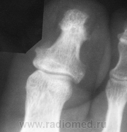 Пациент 1969 г.р. пришел к травматологу с жалобами на боли в I пальце. Палец гиперемираван, отечен. Болеет несколько дней.  Травму как таковую отрицает, хотя недавно был легкий ушиб этой области. Не могу понять что это. На остеомиелит, по-моему, не похоже, хотя... Травматический характер изменений сомнительный. Что-нибудь опухолеподобное в мягких тканях? Проследить пациента скорее всего не удастся. Хотелось бы услышать мнение коллег.