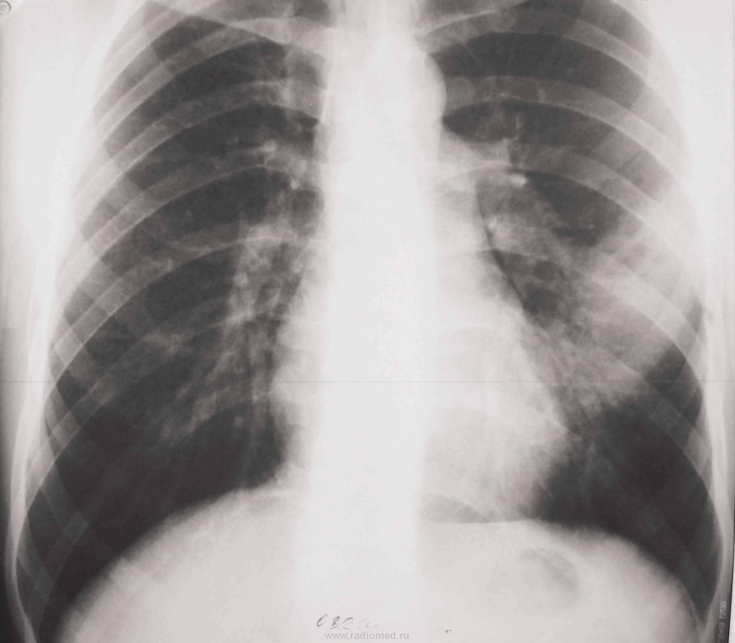 Молодой человек поступил в инфекционное отделени с тонзилитом. В день поступления флю - норма. Явления тонзилита прошли, но температура не снижалась. Сделали повторную флю и выставили пневмонию. Выставляю флюорограммы с интервалом в 1 неделю. Данные изменения держатся месяц без како-либо динамики. В анализах только повышенное СОЭ, колеблется от 20 до 38. В плане КТ.