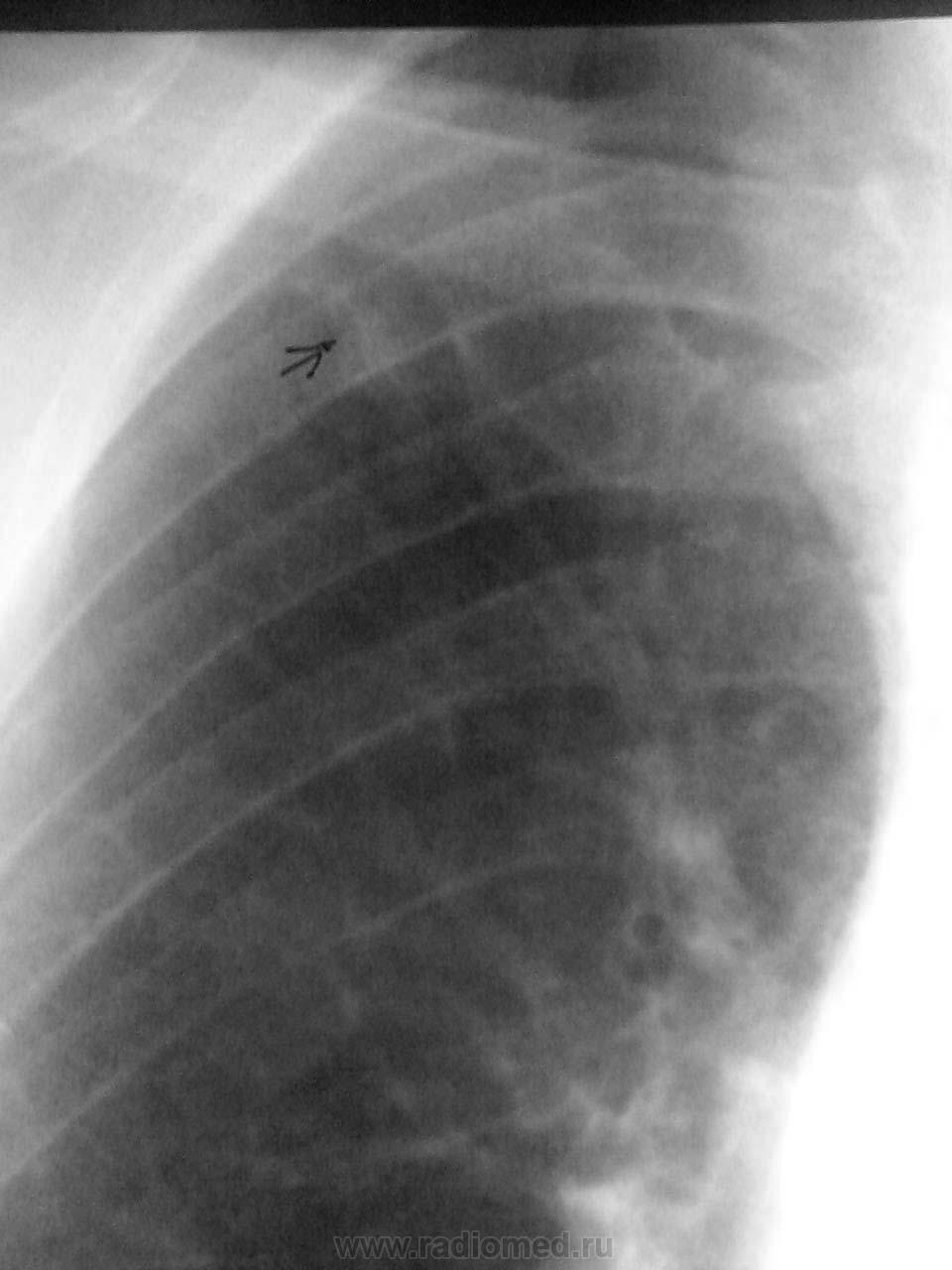 Несмотря на невысокое качество снимков, смотрится тень как инфильтрат. А если немного поработать в цифре, то начинает маячить и тень за 7 ребром... Пропуск. Так бывает. Печально. Но факт...
