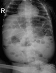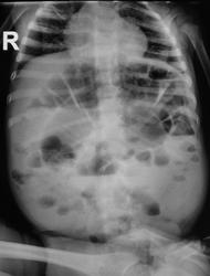 Мне кажется, что обьем брюшной полости значительно увеличен, также резко увеличены диаметр и длина толстой кишки, очень похоже на мегаколон - вероятнее всего болезнь Гиршпрунга. Могут быть и другие причины, вплоть до банальной диспепсии, но клиника все-таки больше опять за Гиршпрунга. Хорошо бы ирригоскопию сделать, да желательно вместе с хирургом (у нас почти всегда так делается).