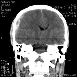Здесь гематома больше лентовидная, распространяется по все поверхности полушария от основая до макушки, и от лба до затылка. Довольно характерная картина субдуральной гематомы.