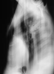 Прошел год, пациент значительно потерял в весе, температура около 38 градусов, кашель с мокротой и был доставлен в рентгеновский кабинет на носилках.
