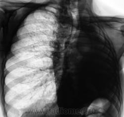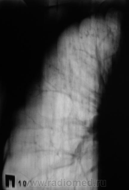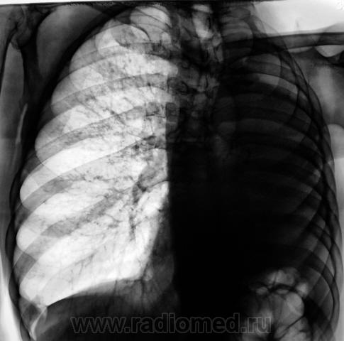 Пациент, заслуженный в прошлом, подданный "Его Величества", 10 лет тому был прооперирован - левосторонняя пульмонэктомия по поводу фиброзно-кавернозного туберкулёза. Вроде-бы все было нормально, время - от времени шел на встречу к работникам фтизиатрической службы, являясь после неоднократных напоминаний, делая им одолжение... Но в последние 3 года пропал. 2 месяца тому был найден, приглашен и явился. Чувствовал себя хорошо, даже не стал возражать против рентгенографии. Но смутили очаги, которых ранее не было в верхней доле правого лёгкого.