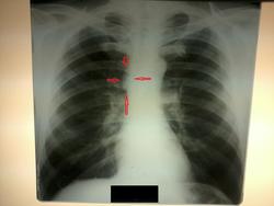 Если имеется в виду доп. тень, проекционно прилежащая к восходящей аорте, то согласен с Вами. Требуется томографическое дообследование.