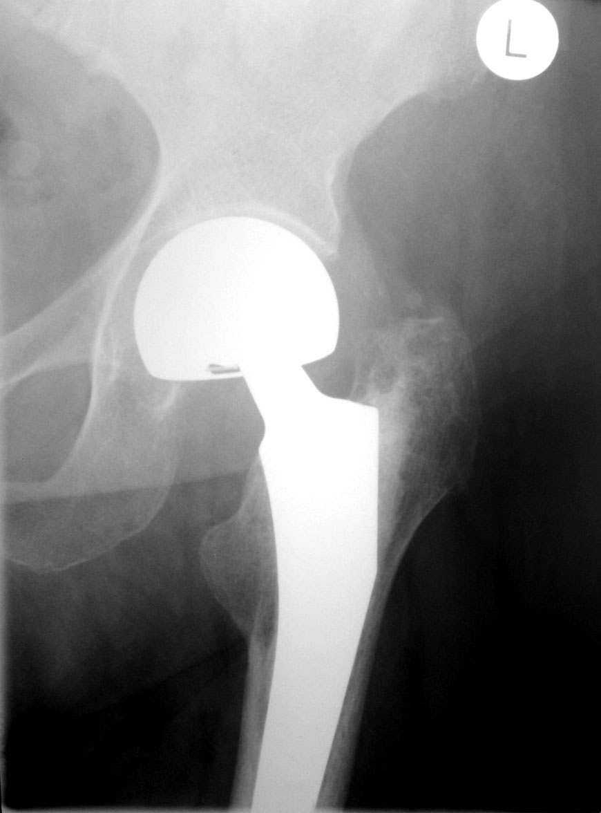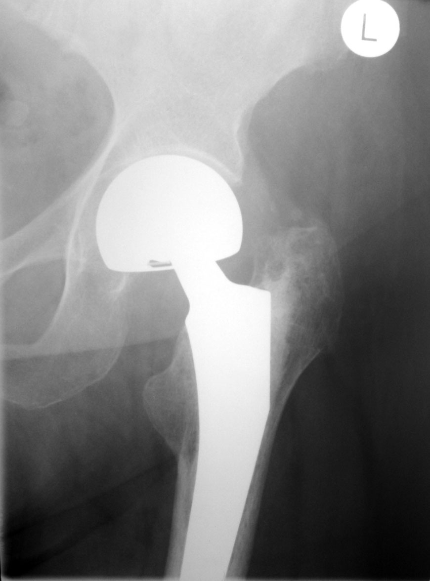 Спасибо всем за участие, а Борису Юрьевичу за высококвалифицированную консультацию. Я такой эндопротез раньше не видел. А предыдущие рентгенограммы пациентки недоступны.