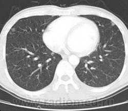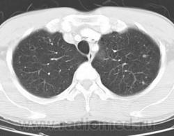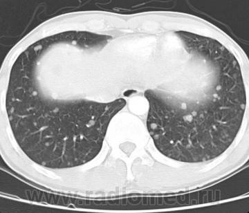 Судя по аксиалам - полиморфные, преимущественно округлой формы тени высокой плотности в средних и нижних отделах обоих легких (mts, туберкуломы, кисты?). А по другим проекциям?