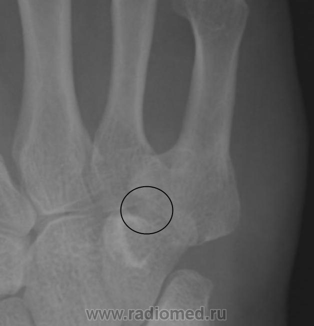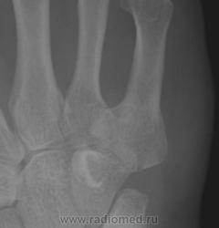 Асептический некроз основания V пястной кости? Описывают же "раструбообразную деформацию" головки плюсневой кости при болезни Келлера, может быть здесь возникло нечто подобное. Костный фрагмент.