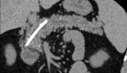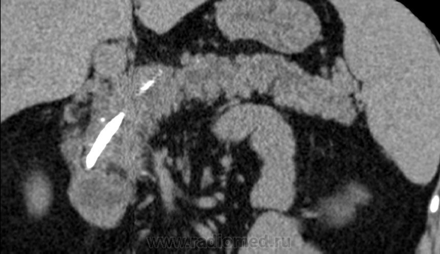 Гм, интересно получается. Во первых спасибо за комменты, мы уже весьма близки к правильному ответу. Во вторых - давайте порассуждаем по поводу "пророс" - как вы определили что стент "пророс" - ???? Разве есть на представленных изображениях какие либо признаки "просрастания"? И последнее, если что-то чем-то прорастает, особенно если это стент Вирсунга, это означает что имеется опухоль. Разве здесь есть признаки опухоли поджелудочной железы? Тем более что исследование нативное, без контрастирования.