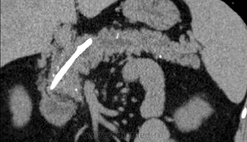 Что-то в Вирсунге. Стент? Дренаж? Странно, что не видно просвета. Очень интересно, что же ЭТО.