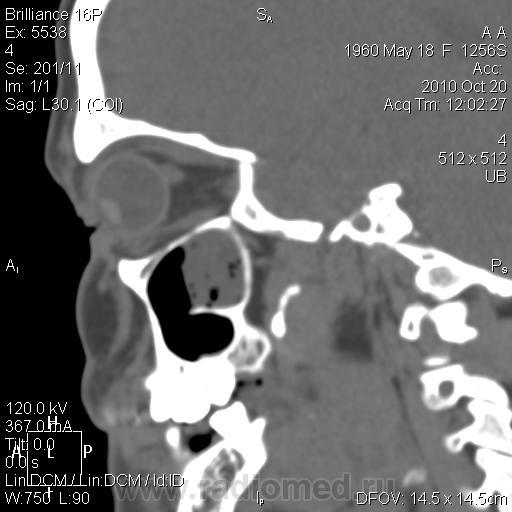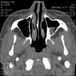плотность. Есть серая шкала, от черного (воздух) до белого (кость). Остальное - оттенки серого. Я подобрала режим для демонстрации, чтоб наиболее выигрышно показать и пазуху, и ее содержимое. В данном случае больше вероятность за нагноение кисты: пузырьки газа, гнойная плотность патологического содержимого. Более жидкая субстанция растеклась бы, а полип имеет большую плотность (40-60 единиц). Было бы интересно проследить динамику, но пациентка категорически отказалась от пункции, так что вероятнее всего, что история на этом и закончится. А ППН можно и на животе делать с запрокидыванием головы назад - только для пациента не очень удобно, а при шейном остеохондрозе иногда и невозможно.