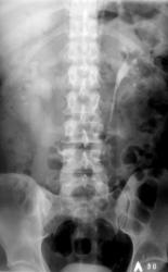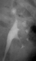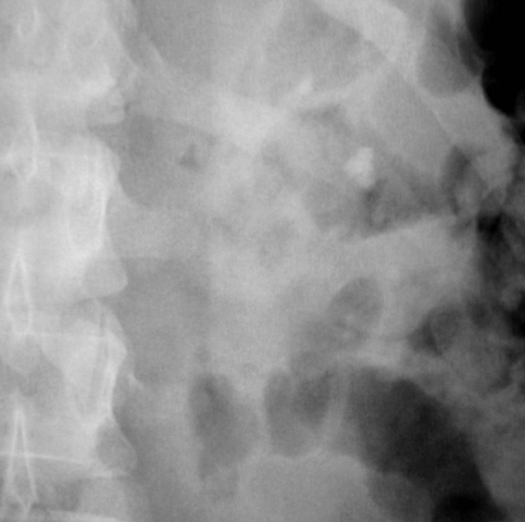 Пациент с клиникой левосторонней почечной колики направлен на рентгенологическое исследование почек и мочевыводящих путей.