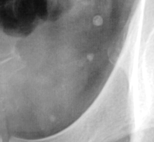 Иллюстрации 4, 5. В малом тазу справа на уровне последнего крестцового позвонка определяется тень характера конкремента, располагающаяся, вероятнее всего, в нижней трети правого мочеточника.