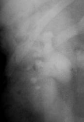 Иллюстрации 1, 2. На обзорной рентгенограмме области почек и мочевыводящих путей слева на уровне Т12 и Л1 определяются две тени характера конкрементов различных размеров значительной интенсивности неоднородной структуры.