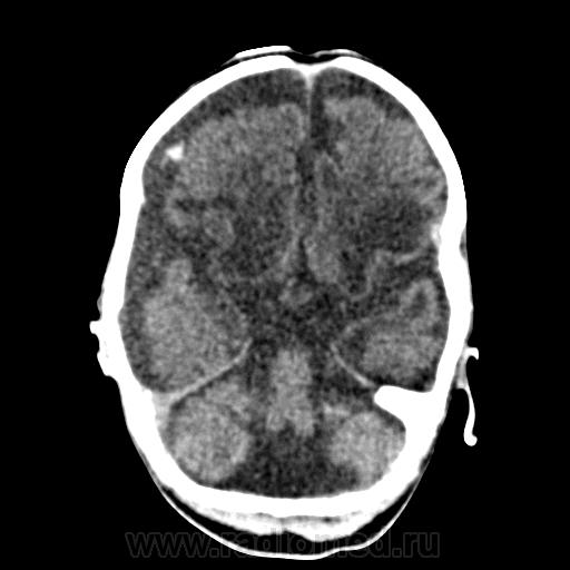 Уважаемые, Коллеги! Ребенок почти 2 месяцев, с основными симптомами на томограммах  вроде бы все понятно, но остался один, не ясный для меня, момент! Подскажите, пожалуйста, что за гиперденсивное включение в субарахноидальном пространстве правой лобной области.
