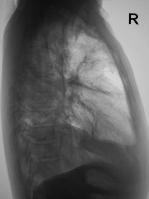 При динамическом рентгеновском наблюдении определяется изменение конфигурации тенеобразования в нижне-наружних отделах справа, сливающиеся с куполом диафрагмы. Но на этом фоне обращает внимание сближение ребер правой половины грудной клетки, а также сохраняется впечатление объемного уменьшения правого легкого. При этом тень средостения частично смещена влево, а просвет трахеи занимает срединное положение. Складывается впечатление сохранение просветов бронхов. Все это заставляет думать о длительном течении гидроторакса справа, вероятно осложненного воспалительным процессом, с формированием выраженных фиброзных изменений, вызывающих уменьшение объема правого легкого.