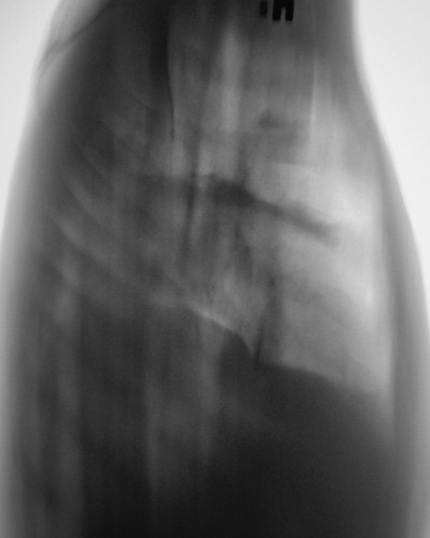 На рентгенограммах, произведенных в прямой и правой боковой проекциях, получена такая скиалогическая картина.
