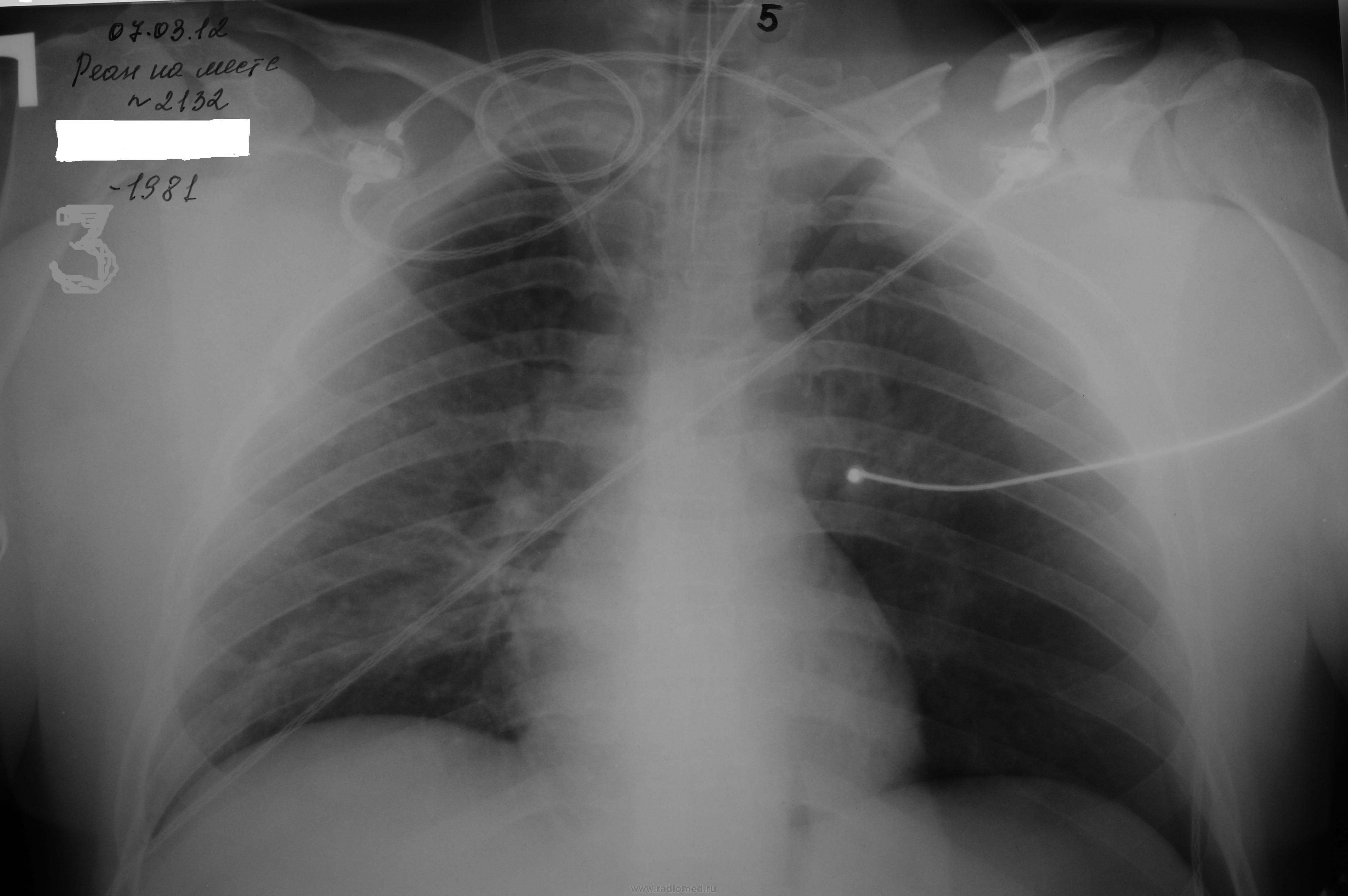 Не вижу признаков напряженного пневмоторакса, тень средостения на месте, межреберные промежутки не расширены, диафрагма не уплощена. Почему решили, что это напряженный пневмоторакс?