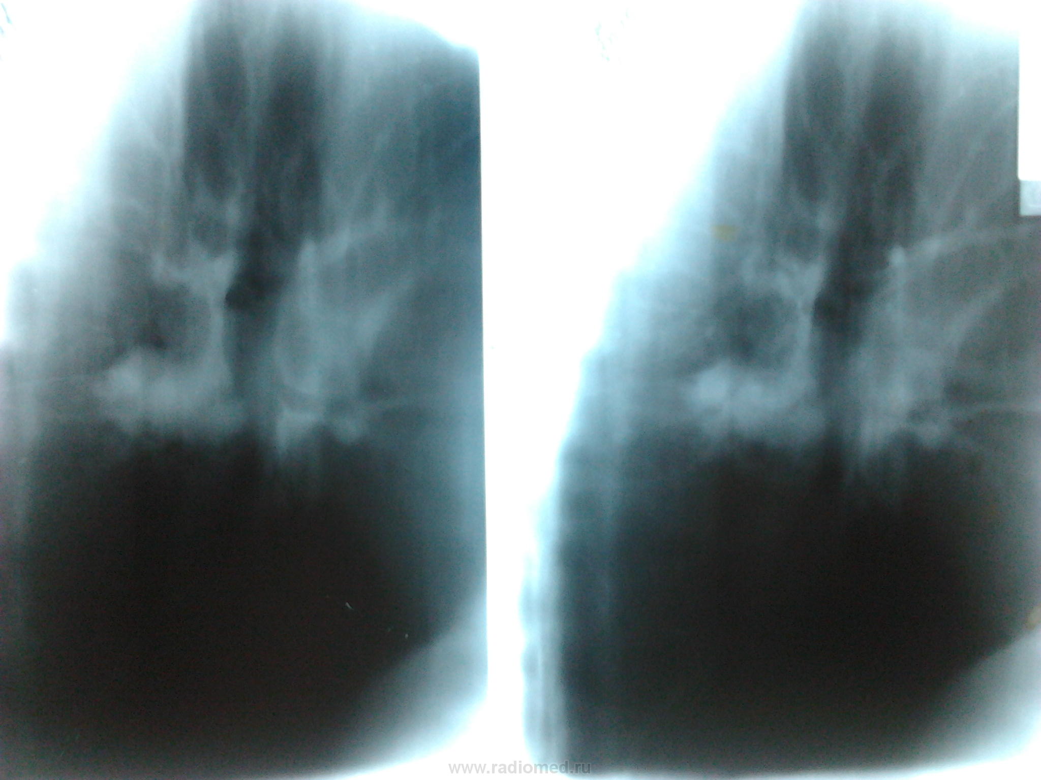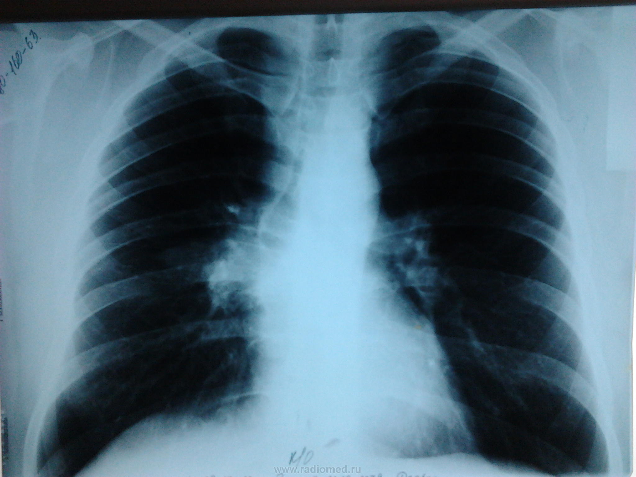 Молодой человек, 32 г. Особых жалоб нет (покашливание,иногда по вечерам субфебрилитет). Сделали обзорный снимок, -и понеслось... Не стала выносить на экспертизу, т.к. чувствую вину за обз.снимок. Поэтому по просьбе публики назову правильный ответ в любое время.Обратите внимание на заголовок