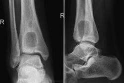 Молодой человек 18 лет поступил в стационар с ноющими периодическими болями в правом г/стопном суставе, год назад, в августе была травма(во время тренировки), по снимку без костно-травматических изменений, а вот снимок проведенный 28.06.10г.: