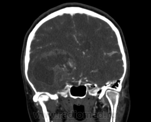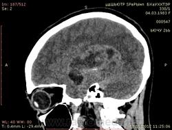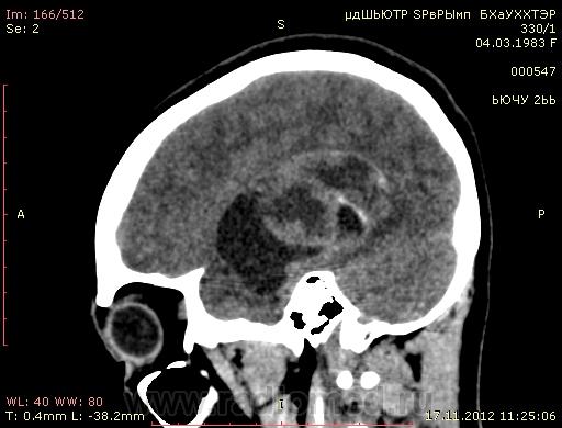 Глиобластома с прорастанием стенки правого бокового желудочка, выраженный отек, смещение срединных структур, вклинение миндалин мозжечка в БЗО.