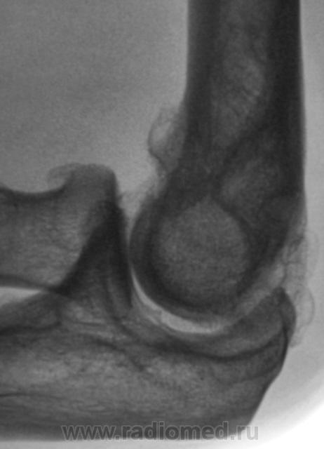 Наверно, застарелый перелом в области блока плечевой кости. Не понятен периостит.