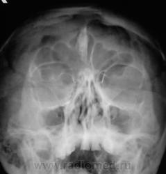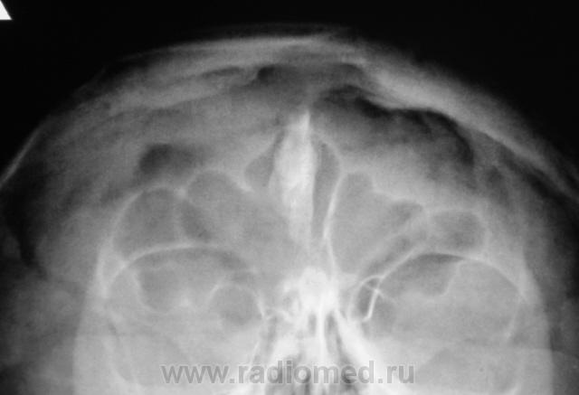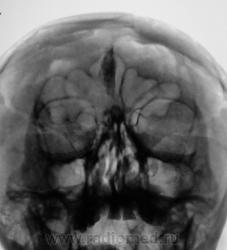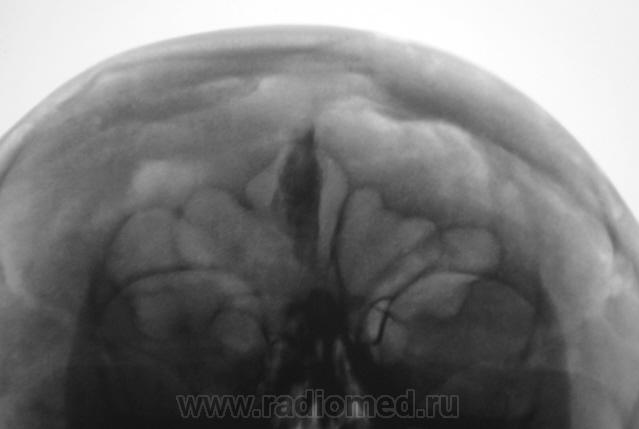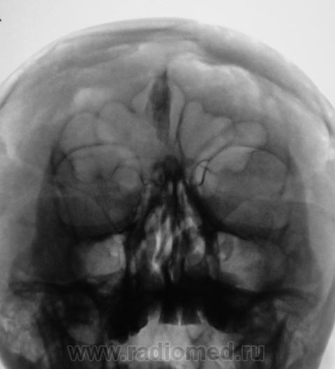 Гиперпневматизация лобных пазух. Обызвествление серповидного отростка. Вероятно, повышение внутричерепного давления (сосудистый рисунок). Искривление носовой перегородки вправо