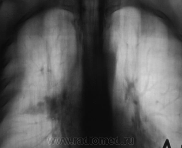 Вообще-то, объёмного уменьшения нижней доли справа нет ( все сосуды на месте)-вероятно, это не ателектаз.