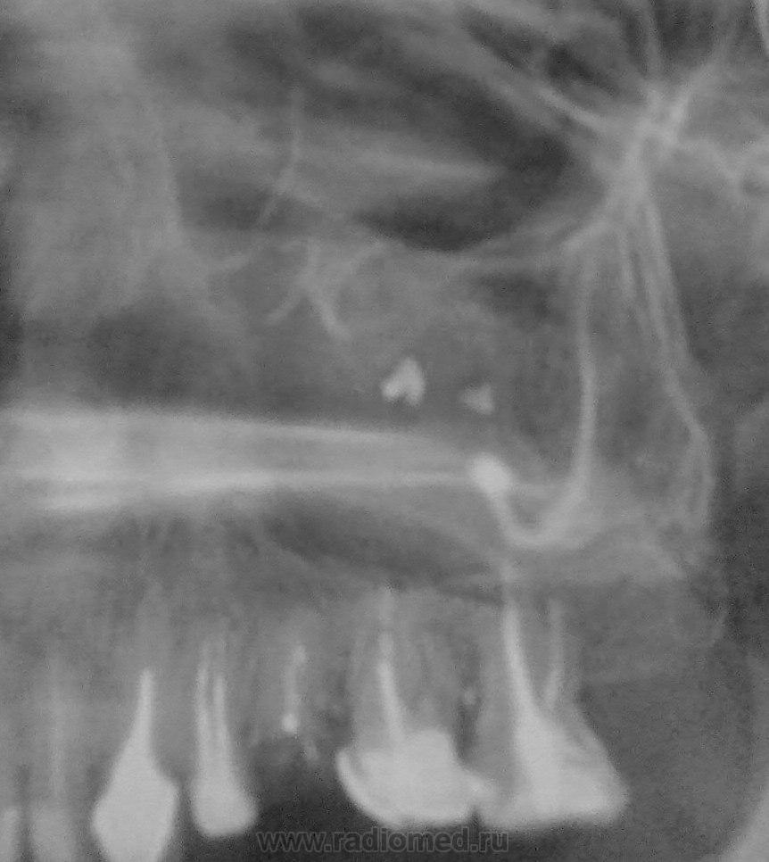 В области зуб 2.7 выведен пломбировочный материал в области ВЧП, вокруг пл.материала вероятнее всего образуются мицетомы. Одонтогенный левосторонний гайморит. Мицетома левой ВЧП. Конультация ЧЛХ.