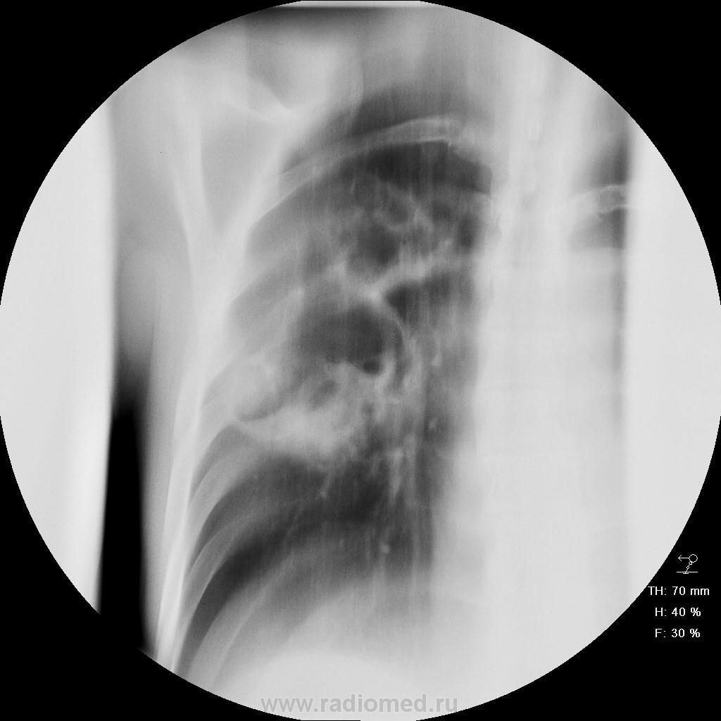мужчина, 50 лет, социально благополучный, поступил с жалобами на температуру до 39, боль справа, утомляемость и т.д. В анализах высокое СОЭ, лейкоцитоз. Заболел остро 2 недели назад, когда в поликлинике выставили по флю пневмонию в S2 (со слов) и стали лечить... Всвязи с отсутствием положительной динамики направили к нам в пульмонологическое отделение.