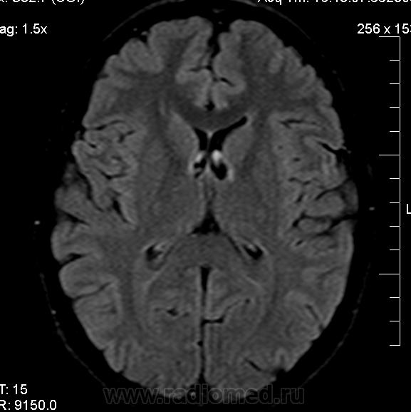 Иногда у пациентов с дисциркулятонной энцефалопатией по периферии расширенных периваскулярных пространств встречала линейное повышение нтенсивности МР-сигнала на Tirm, расценивала как периваскулярый глиоз, и у нескольких пациентов перенесших перинатальную энцефалопатию видела относительно симметричные зоны паравентрикулярного глиоза резидуального характера в области задних и иногда передних рогов. Поэтому и задумалась, увидив такую асимметричность интенсивности сигнала в этом случае, заподозрив "нерезко выраженный" глиоз справа.