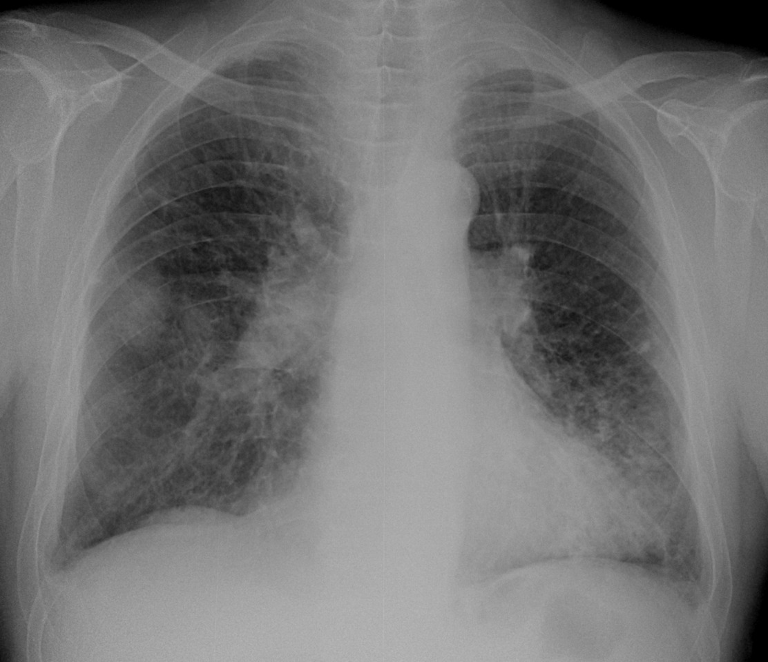 Случай 2.  М, 79 лет. ИБС, ГБ, обостение бронхита. Сейчас жалобы на подъем температуры до 38,4 кашель со слизисто-гнойной мокротой. Что скажете на счет него? Мне не нравится "мазня" с обеих сторон в нижних отделах, больше слева, правый корень и тень справа. Онкология может. Снимки на сегодня: