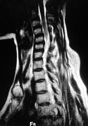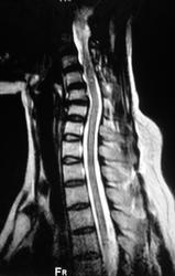 Патологический кифоз в шейном отделе позвоночника. Снижен сигнал и высота диска в сегменте С5-С6, в этом же сегменте небольшая передняя и задняя грыжки. В грудном отделе ось позвоночника отклонена вправо.
