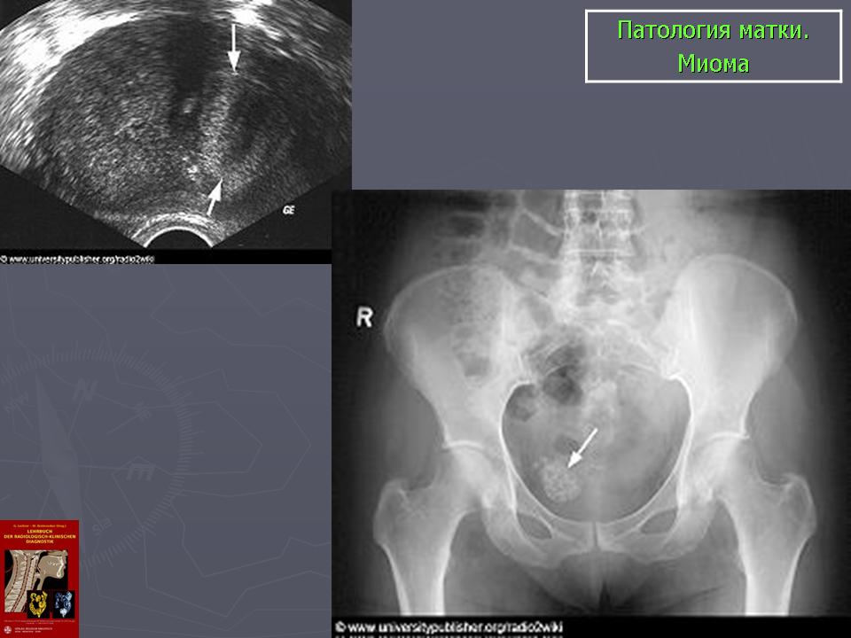 Не знаю, указывает ли ли фраза в описании случая "Пациент 54 года" на половую принадлежность. Если да, то - не миома. Структура левой бедренной кости схожа с болезнью Педжета. Тень на фоне прямой кишки больше всего напоминает... чайную ложку