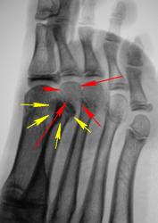 На мой взгляд, желтым - сесамовидная кость, красным - интактная головка плюсневой