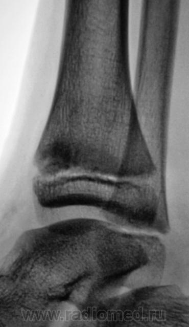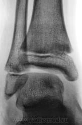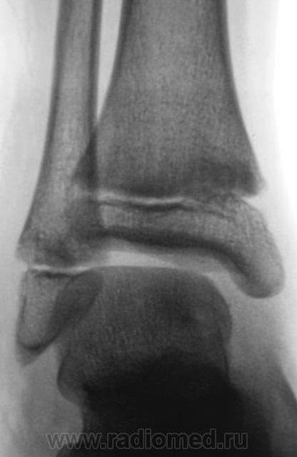 Травма. Пациент направлен хирургом на рентгенографию голеностопного сустава. Произведено стандартное исследование.