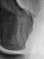 Участок обызвествления у медиального надмыщелка бедренной кости. Возможно оскольчатый перелом.