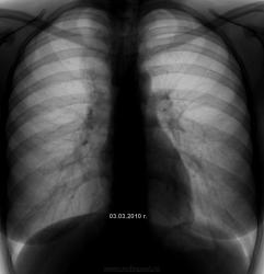 Следовательно, на первом снимке, по правому контуру тени "сердечно-сосудистого массива" тень косы? Если да, то такое может навеять мысли об "исходящем из средостения"?