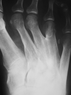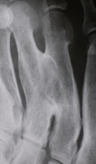 Иллюстрация 2. Рентгенограмма в косой проекции. Визуализируется деформация 3 и 4 плюсневых костей, синостоз между диафизами 3 и 4 плюсневых костей.