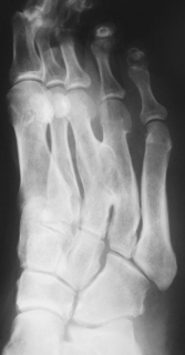 Иллюстрация 1. Рентгенограмма в прямой стандартной проекции. Определяется патологический синостоз между 3 и 4 плюсневыми костями. Определяется некоторое утолщение и деформация проксимальной ½ 2 плюсневой кости.