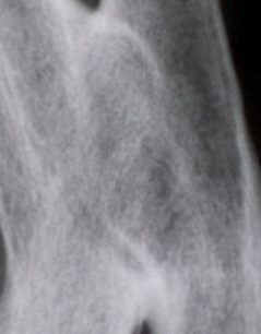 Иллюстрация 3. Фрагмент рентгенограммы области патологического синостоза, произведенной в косой проекции с увеличением.