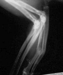 В послеоперационном периоде вел себя плохо, залез и упал на больную конечность с метровой высоты. Сдирал бинты постоянно.