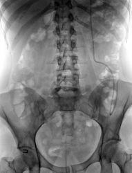 Да, Вы правы это вентрикуло-перитониальный шунт, уже в приемном отделении я  убедился окончательно. Была какая то травма связанная с ДТП, как следствие ЧМТ, в дальнейшем развитие гидроцефалии-ВПШ, передняя брюшная стенка вся  в после операционных  рубцах. По поводу же травматических изменений таза и поясничного отдела позвоночника, этого точно ни могу сказать. Чуть позже продемонтрирую экскреторную урографию, а пока сказать что это не является причиной почечной колики на 100% нельзя.