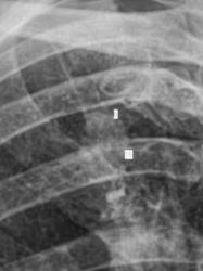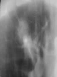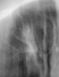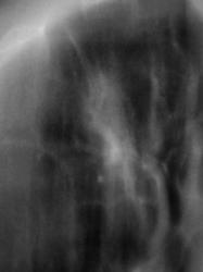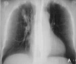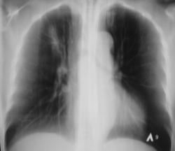 Пациентка направлена на профилактическую флюорографию, жалоб не предъявляет. Исследование проведено в прямой стандартной проекции на цифровом флюорографе «Ренекс-Флюоро». При расшифровке флюорограмм заподозрено наличие крупноочаговой тени на фоне 1 межреберья справа. Пациентка «взята на контроль».