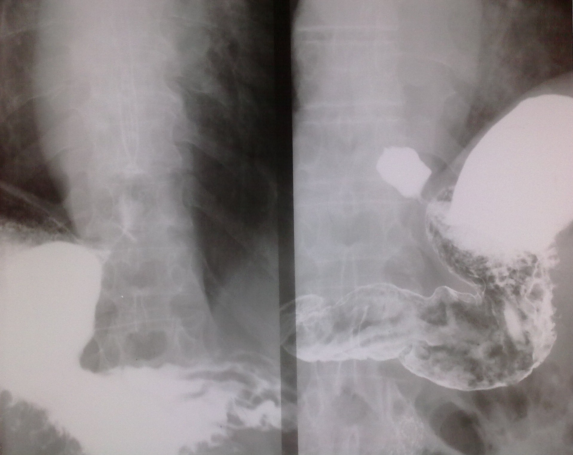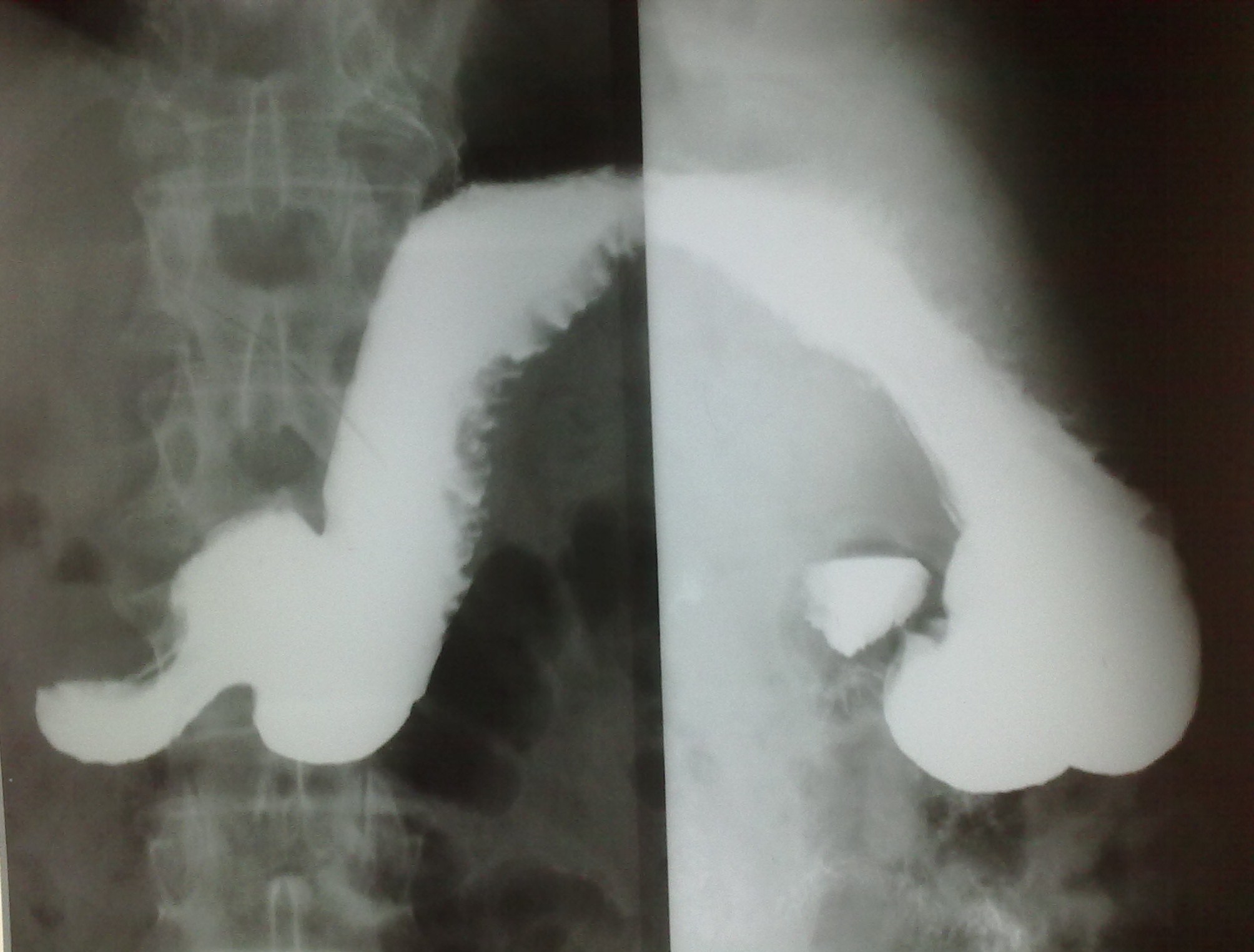 И еще - гиперпластический гастрит, все-таки, достаточно редок, хронический гастрит, в основном, атрофический; неровность контура по большой кривизне в антральном отделе - является признаком хр гастрита (выход складок на контур); двуслойное содержимое луковицы 12-перстной кишки (газ и барий) - р-признаки бульбостаза (бывет еще 3-хслойное содержимое - барий-жидкость-газ) - косвенного признака патологии желчевыводящих путей.