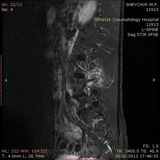 Молодой человек, 21 г. Жалуется на боли в пояснице слева. Занимался спортом, делал упрожнения с гантелями, с наклоном корпуса влево и вправо, после чего почувствовал боль. На уровне левого дугоотросчатолого сочленения L4 позвонка спереходом на дужку и тело определяется зона с повышенным МРС. Приледащием мышцы также отечны. Как вы думаете, что это может быть? Не нравится увеличеннное в размерах левое дугоотросчатое сочленение.