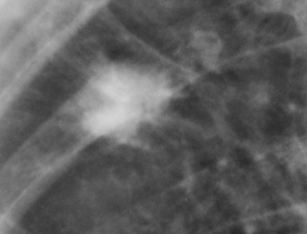 Можно согласиться с предидущим постом. Отложение извести (туберкулома?),но контуры какие-то нечёткие и тяжтстые. Для оценки динамики необходим R-архив.
