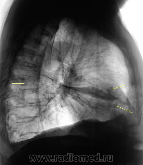 Флюорограмму расшифровывал врач того учреждения, откуда флюорограф, ну и рекомендацию "что сделать" - от туда. Но с учетом наличия синдрома "затемнения вне анатомических границ", конечно, лаборанты сделали и боковую, а уже только после этого пригласили "нашего" врача-рентгенолога "для принятия решения".